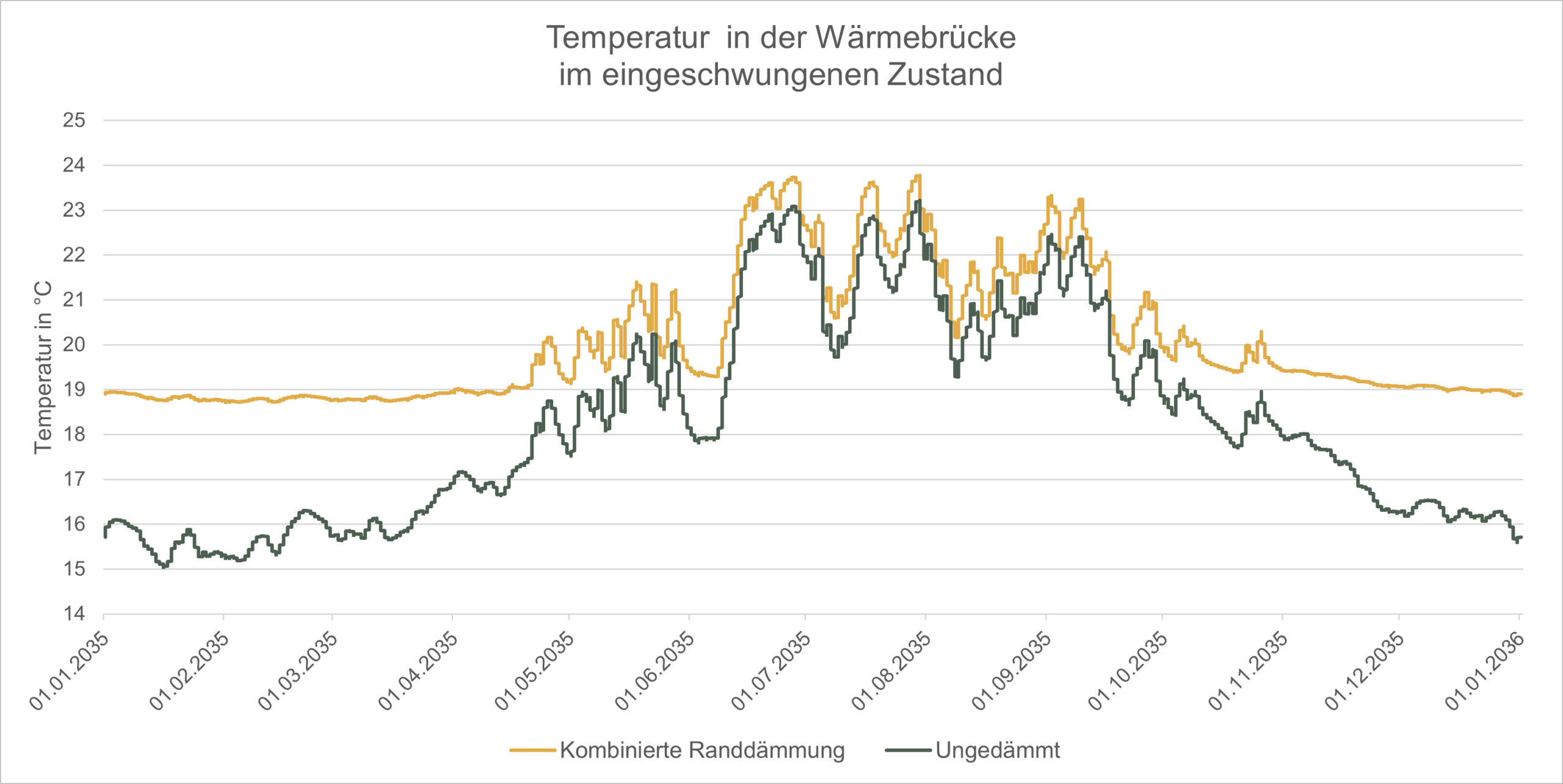 Genau diese zeitliche Entwicklung zeigen die Videos aus einer WUFI® 2D-Simulation: Man sieht, wie sich die Wärmelinse von Jahr zu Jahr aufbaut und wie stark sie von der Randdämmung am Fundament beeinflusst wird (erstes Video). Im zweiten Video sieht man den direkten Vergleich der ungedämmten Bodenplatte gegenüber der durch die Randdämmung gedämmten Bodenplatte.