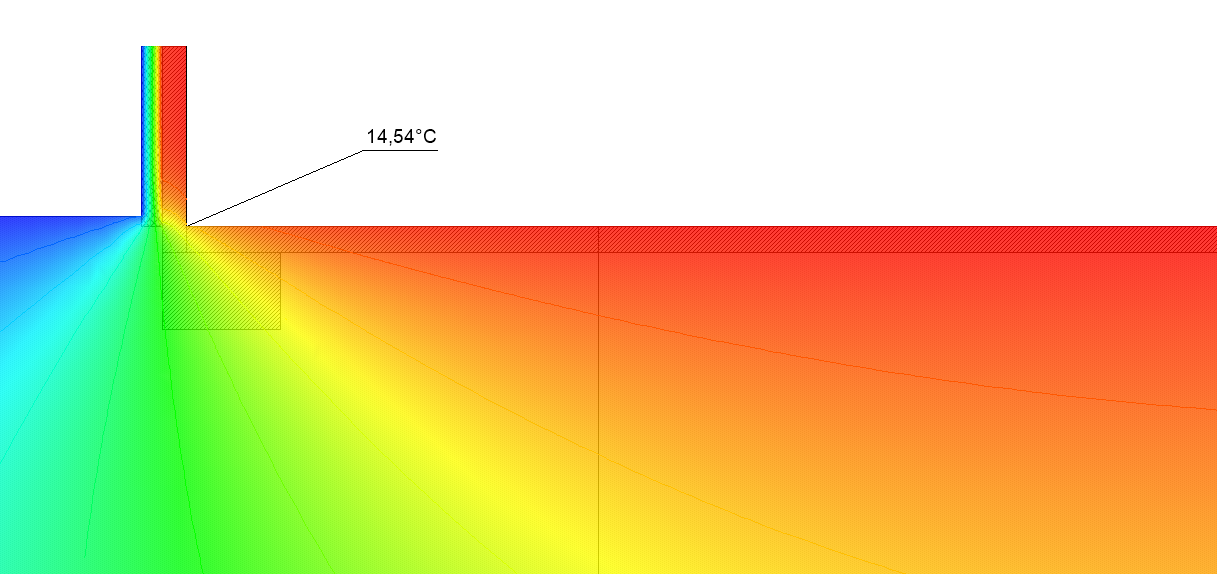 Ungedämmte Bodenplatte: Temperatur in der Wärmebrücke 14,54°C
